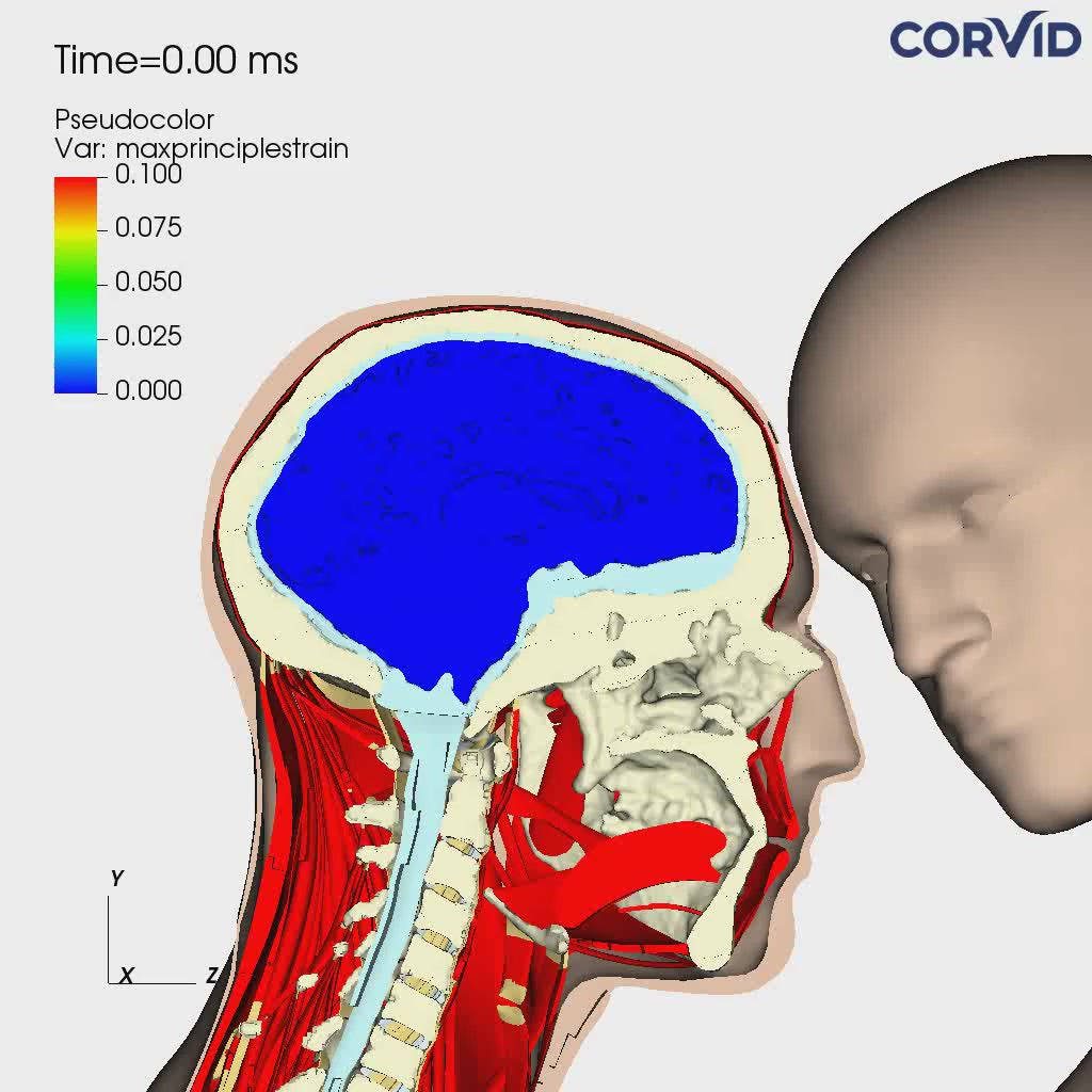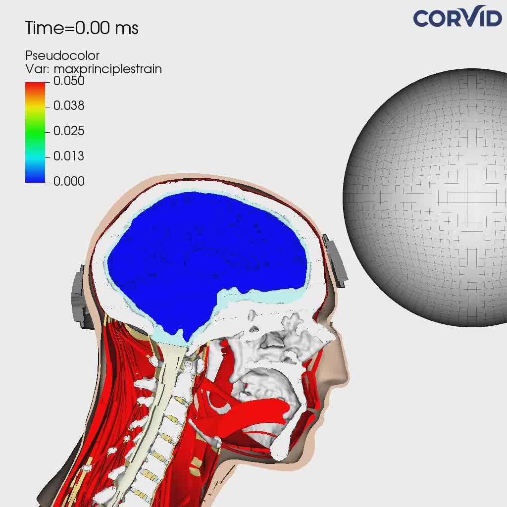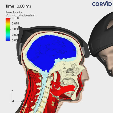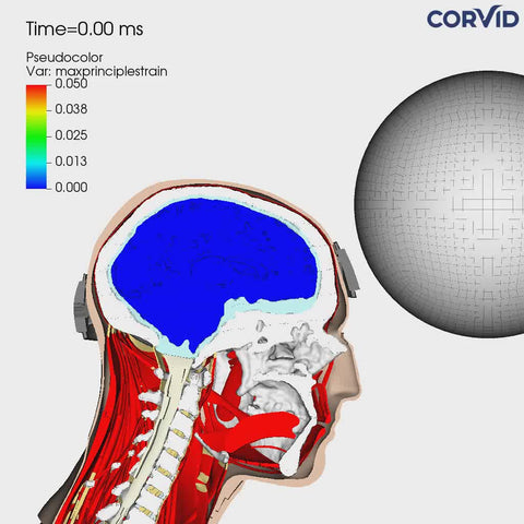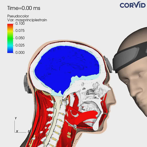 A world first virtual simulation for football utilizing real-life brains, deriving from MRI scans, of NCAA Division 1 athletes to analyze head impact events and measure brain strain with and without the use of SYZMIK Headgear.